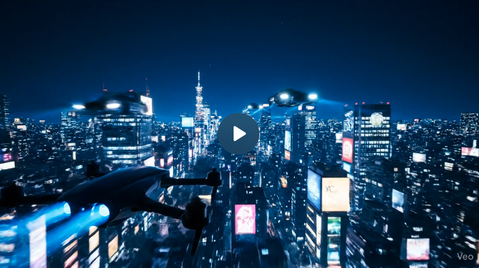 例えば、「東京の夜景をドローンで追いかける、サイバーパンク風の映像。車とネオンがきらめく。」のように、カメラの動きや雰囲気まで詳しく指定すると、よりイメージ通りの動画になります。 - 生成を待つ:数分待つだけで、世界に一つだけのハイクオリティな動画が完成します。