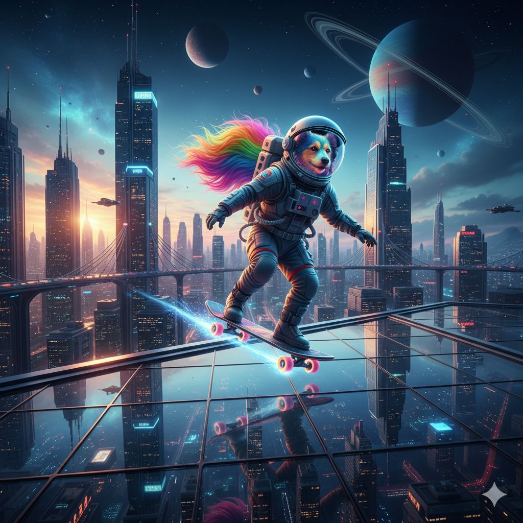- プロンプトを入力!:「虹色の毛皮を持った犬が、宇宙服を着てスケートボードに乗っている。超現実的で、高解像度のフォトリアルな一枚。」のように、具体的に描写します。