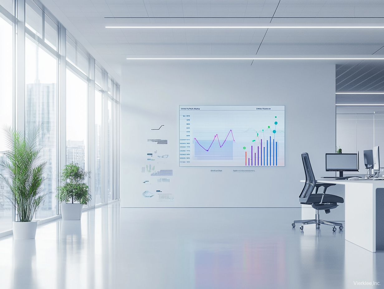 Minimalist modern office space with floating holographic charts, clean white background, 3D render, smooth texture, professional concept art –ar 4:3 –v 6.1 - ぶーちゃん補足: –ar 4:3 はPowerPointやGoogleスライド向けの比率です。「clean white background」を指定すると、資料全体の視認性がぐっと上がります。